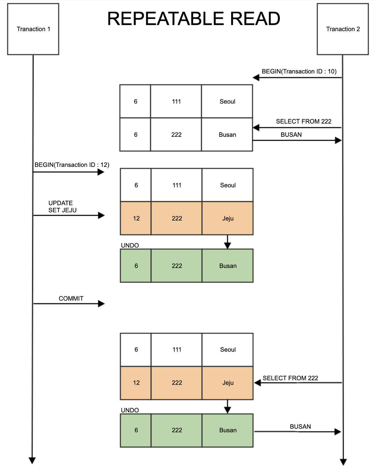 READ COMMITTED의 경우 위의 예시처럼 Transaction1의 UPDATE 가 commit 된 후에만 변경사항이 가른 트랜잭션에 반영된다. Transaction1이 특정 값을 UPDATE 한 후 Transaction2가 그 값을 읽을 때, commit 전에는 UPDATE 하기 전 값, commit 후에는 UPDATE 한 후의 값을 조회한다. 이 경우 Non Repeatable Read 문제가 발생할 수 있는데, 이 문제는 하나의 트랜잭션에서 같은 값을 조회할 때 다른 트랜잭션의 commit 여부에 따라 다른 값이 조회되는 현상이다.