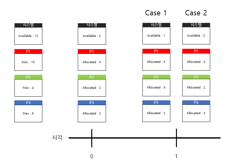 1 시각에 Case 1과 같이 P2에게 2개의 자원을 할당하고 P2 작업이 끝난 이후 4개의 자원을 돌려받아 P1이나 P3의 작업을 완료할 수 있는 안전 순서 열이 존재하기 때문이다. (P2 -> P1 -> P3 or P2 -> P3 -> P1)