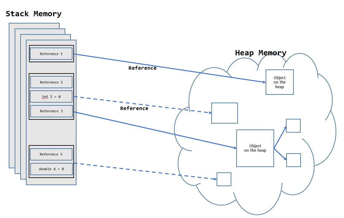 위의 내용처럼 기본형 타입의 변수들은 Stack 영역에 저장되는 반면, 참조형 타입 변수는 참조값만 저장되고, 실제 객체들은 Heap 영역에 저장된다. 즉, Stack 메모리 영역에서는 Heap 영역에 존재하는 객체들에 대한 참조를 가지고 있다.