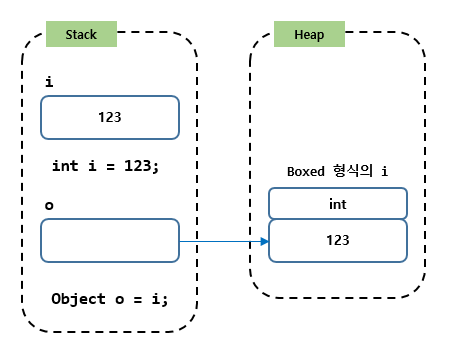 Stack 영역에 있는 i 값이 o로 변환되면서, Heap 영역에 object 형식으로 선언되고, 값이 복사 된다. o는 Stack 영역에 존재하며 Boxed된 i의 주소 값을 가지고 있고, 보통 Boxing은 암시적으로 되며, 명시적으로도 가능하다.