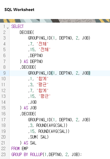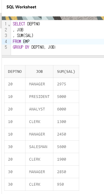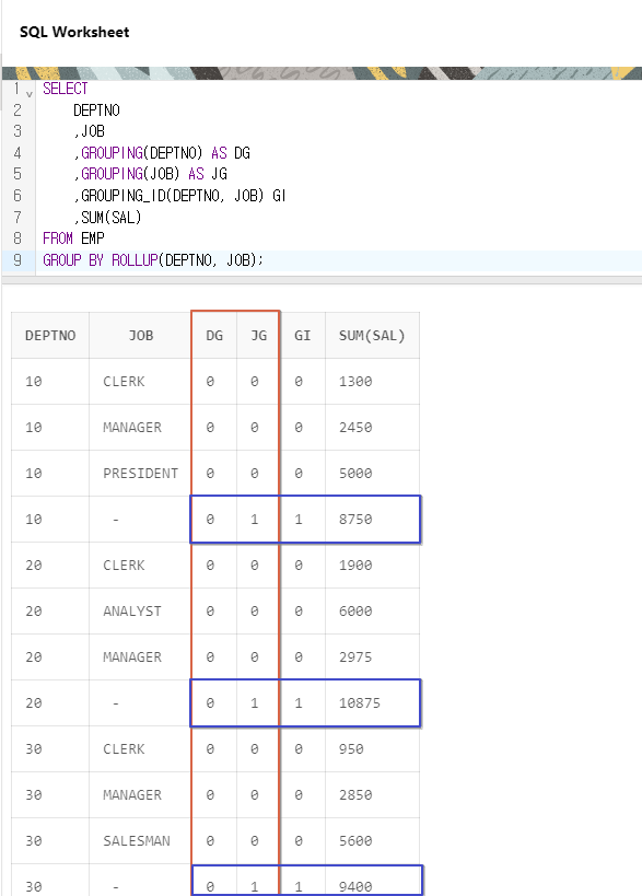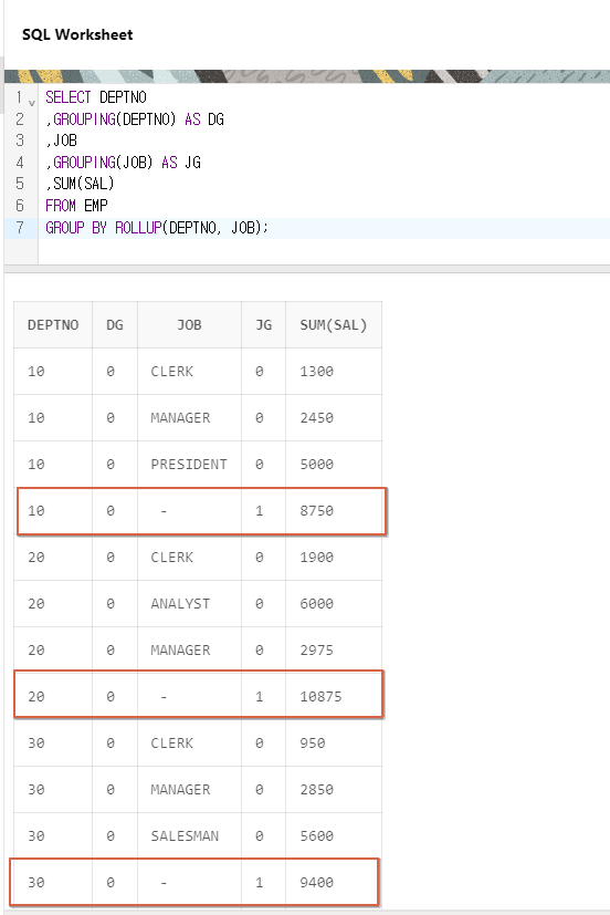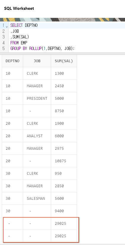 결과를 보니 마지막 2줄이 같은 값이 나온 것을 볼 수 있다. 헷갈릴 수 있지만 ROLLUP의 원리를 생각해보면 별 다를 것 없다. JOB과 DEPTNO가 ROLLUP에서 빠지고 1만 남았을때 SUM(SAL)을 구하려고 하고, 상수에 대한 GROUP은 없다.