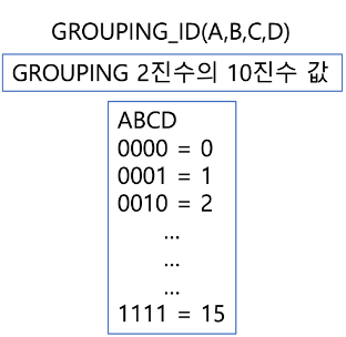 GROUPING_ID 함수는 인자로 들어온 각각 컬럼의 GROUPING 함수 값을 2진수로 합쳐 해당 2진수 값을 10진수로 변환한 값을 반환해준다. 말이 어렵긴 한데 아래의 이미지를 참고하자!