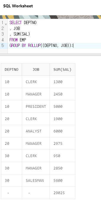 결과를 보니 마지막 2줄이 같은 값이 나온 것을 볼 수 있다. 헷갈릴 수 있지만 ROLLUP의 원리를 생각해보면 별 다를 것 없다. JOB과 DEPTNO가 ROLLUP에서 빠지고 1만 남았을때 SUM(SAL)을 구하려고 하고, 상수에 대한 GROUP은 없다.